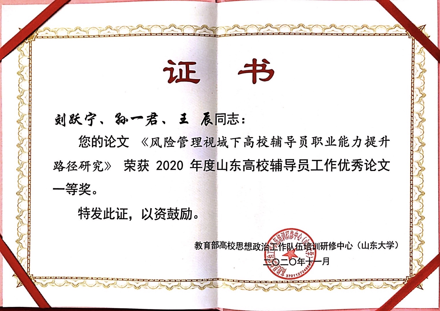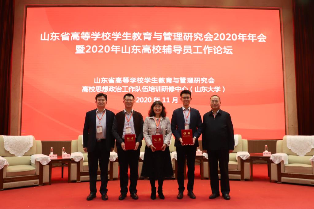 论坛对2020年山东高校辅导员工作论坛获奖论文进行了表彰。全省200余所高校(含高职)推荐的1000余篇论文共有97篇论文获奖(其中一等奖20篇,二等奖33篇,三等奖44篇)。学校共有3篇论文获奖(其中一等奖2篇、二等奖1篇),由我院刘跃宁、孙一君、王辰撰写的《风险管理视域下高校辅导员职业能力提升路径研究》,张显全、王聪、张晓帆撰写的《高校大学生网络思想政治教育应对重大突发公共事件有效性量化研究——基于层次分析法的模糊数学综合评价模型》两篇论文获得一等奖,获奖数量和质量均有重大突破。