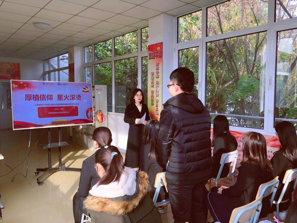研究生党支部书记王聪以“厚植信仰、星火滚烫”为主题,以十九届五中全会及“四史”教育中红色资源为依托,以“党的旗帜、党的历史、党的擘画”三个方面为切入点,重点阐述了马列主义、毛泽东思想、邓小平理论、“三个代表”重要思想、科学发展观、习近平新时代中国特色社会主义思想等理论内涵,讲述了中国共产党的发展历程和辉煌成就,从中国共产党的初心使命谈做有根有魂的青年学生党员,并在如何提高党性、如何做好党员先锋带头作用、如何将个人发展融入祖国新时代发展建设中做出引导启迪。同时,王聪以浅谈初心使命为契机,激励青年党员加强思想淬炼和政治历练,强化理想信念教育和对党忠诚教育,增强“四个意识”、坚定“四个自信”、做到“两个维护”,在贯彻落实习近平总书记重要讲话、重要批示精神的生动实践中提升新时代党员政治素养、理论水平、专业能力、实践本领。