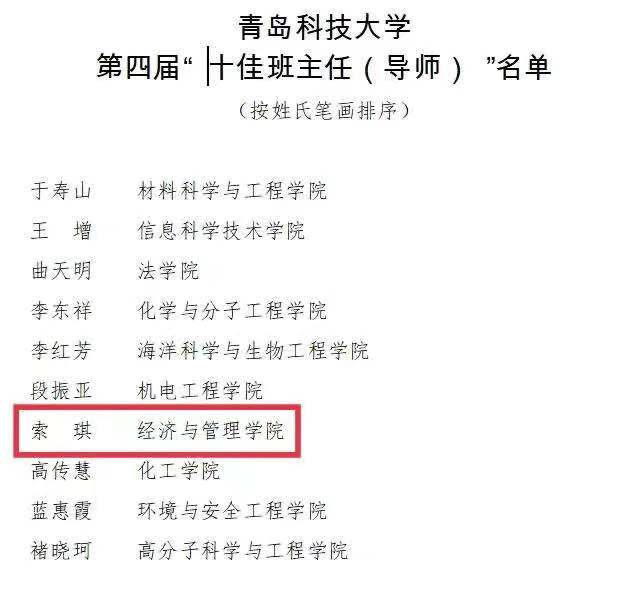 (校区)考核推荐,学校选拔,并经学生评议、网络投票、学校评审并公示等环节,最终选出10名第四届“十佳班主任(导师)”。在担任班主任(导师)过程中,索琪积极投身到大学生思想政治教育和学业指导工作中,在学生思想教育、作风养成、学风建设、素质提升和班集体建设中发挥了重要作用,为促进大学生全面发展、成长成才做出了重要贡献。