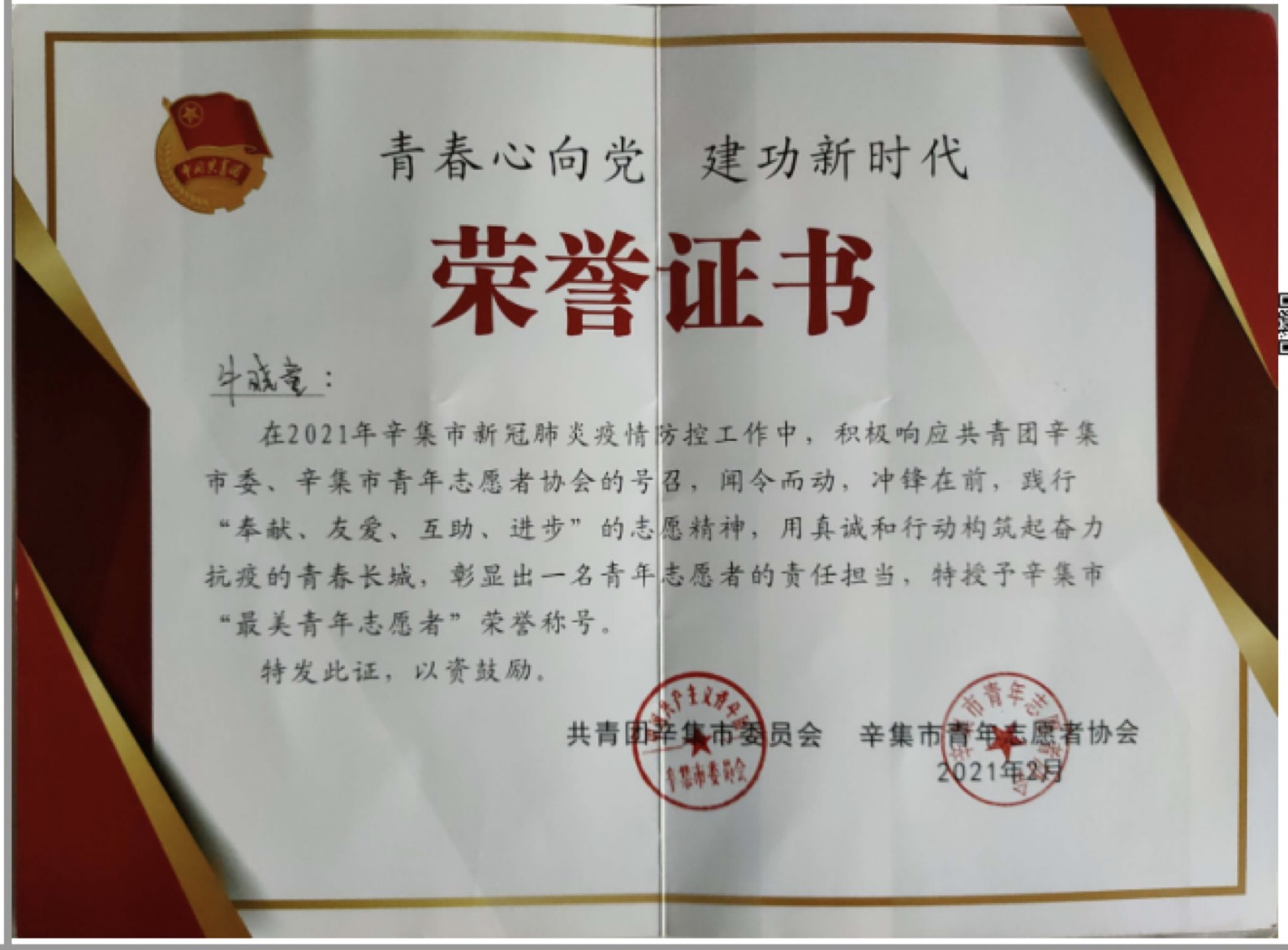 牛晓童同学在疫情防控工作中勇敢逆行,奔赴疫情防控第一线,与志愿者们共同坚守岗位,努力勤恳完成本职工作,践行“奉献、友爱、互助、进步”的志愿精神。在岗期间充分发挥了身为一个共产党员的先进思想觉悟,受市级团委颁发荣誉证书并授予辛集市“最美青年志愿者”荣誉称号。