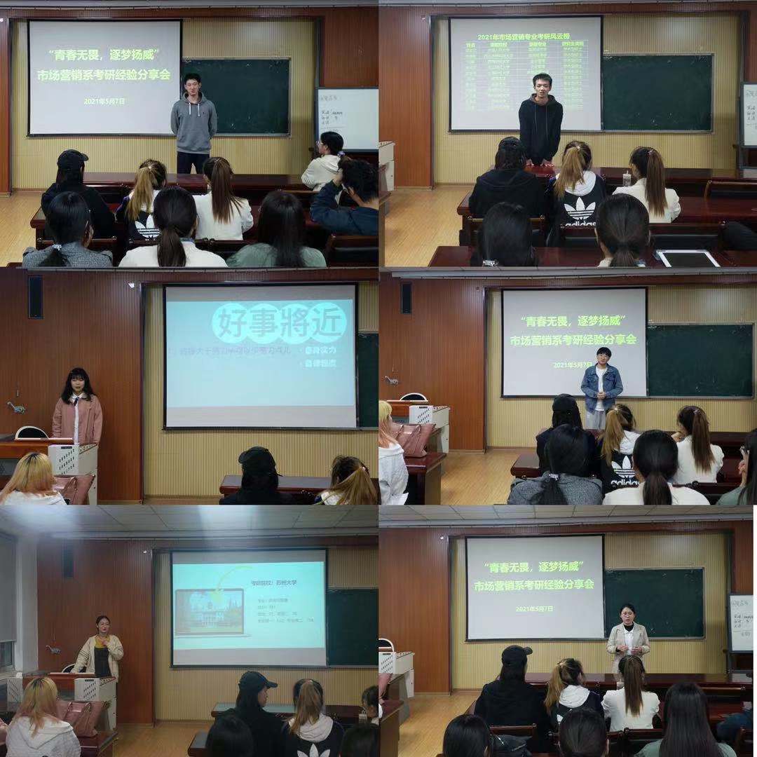 为进一步激发专业学子的考研激情和学习热情,5月7日晚,市场营销系在德扑楼419室举办“青春无畏,逐梦扬威”考研经验分享会,邀请六名考研成功的2017级学子做经验分享,营销系主任安萌老师出席活动,系2018级全体同学、2019级部分同学参加活动。