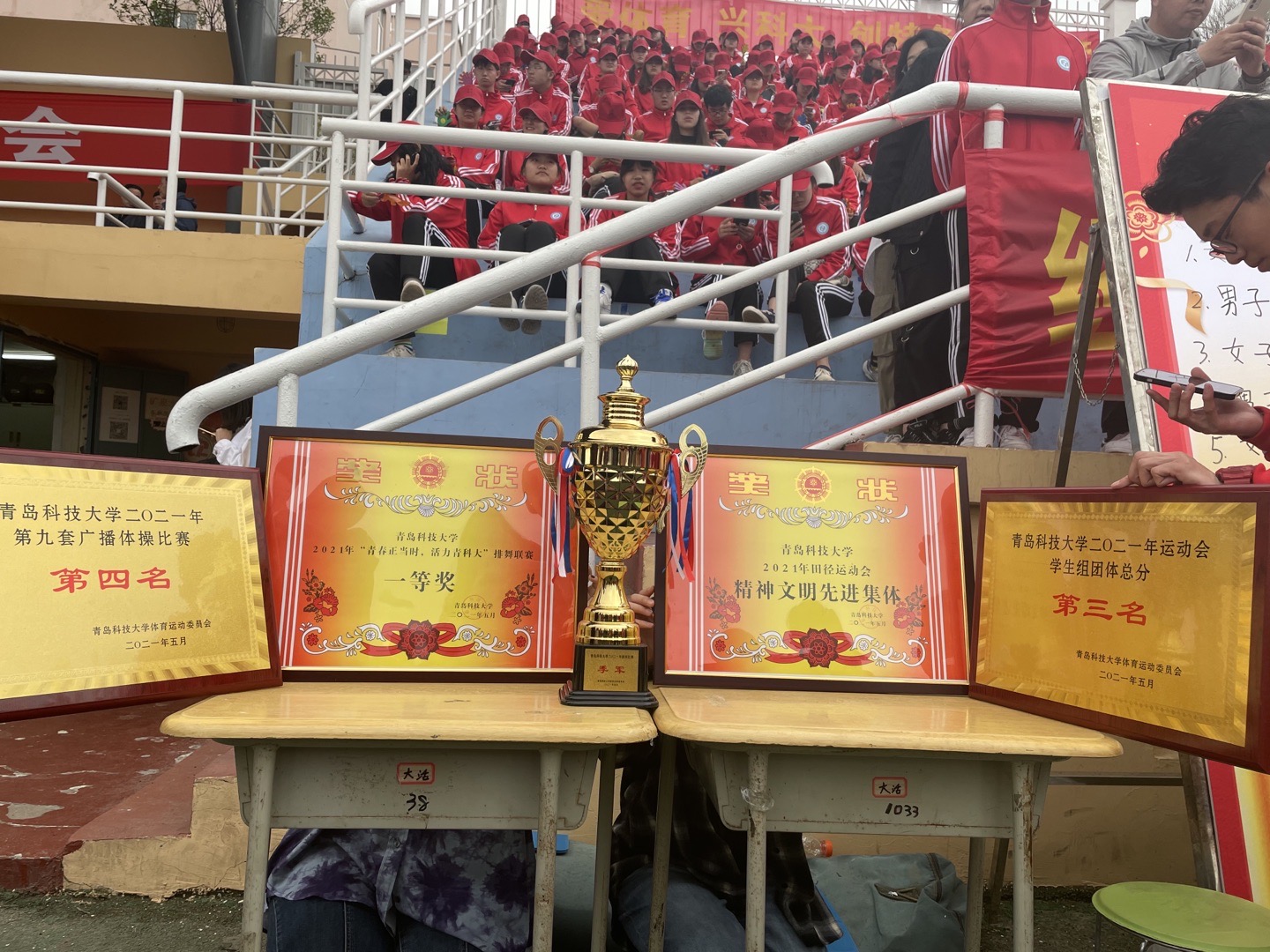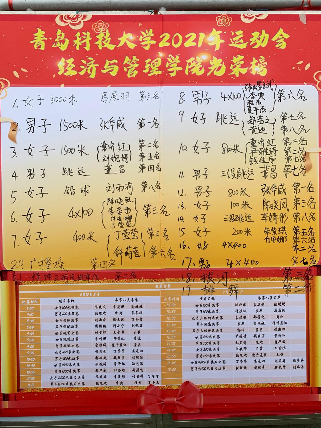 收获——德扑学子再创佳绩。在运动会现场,德扑学子顽强拼搏,斗志昂扬,以团队凝聚力与超强战斗力,最终获学生组团体总分第三名、精神文明先进集体荣誉;田径队取得了崂山校区第一名,四校区第三名的优异成绩,其中张华威夺得男子800米、1500米决赛第一名;董济红获女子1500米第一名、女子800米第二名;女子4*100米接力赛夺得第三名等;排舞联赛获崂山校区第一名、四校区第二名、一等奖的好成绩;广播操比赛获崂山校区第二名、四校区第四名;拔河比赛获得四校区季军。