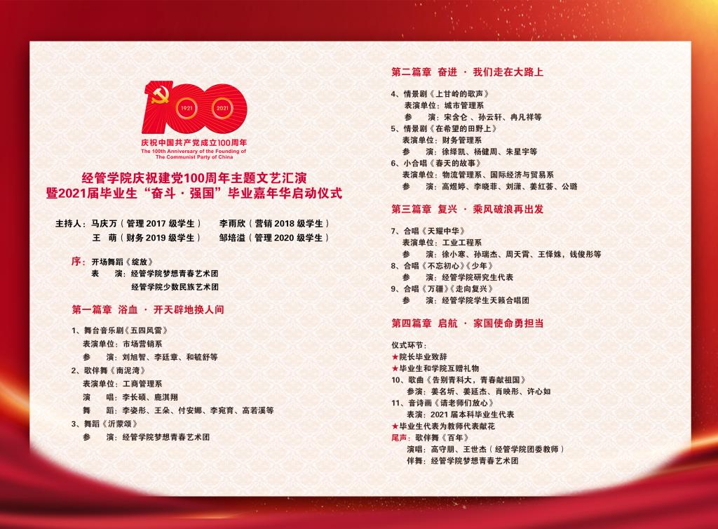 百年征程波澜壮阔,百年初心历久弥坚。6月19日晚,庆祝建党100周年主题文艺汇演暨2021届毕业生“奋斗·强国”毕业嘉年华启动仪式在崂山校区第二报告厅隆重举行。德州扑克俱乐部