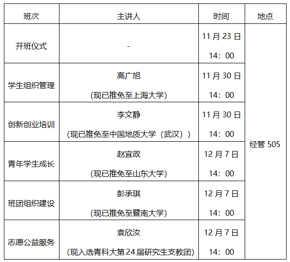 高年级学生骨干中选聘“青马工程”培训班青年讲师团成员,围绕学生组织管理、创新创业培训、班团组织建设、志愿公益服务进行特色培养,具体如下: