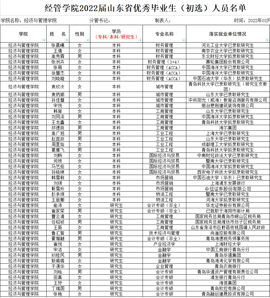 2022届山东省优秀毕业生(初选)人员名单(见下表),予以公示,公示时间:2022年3月18日-22日。
