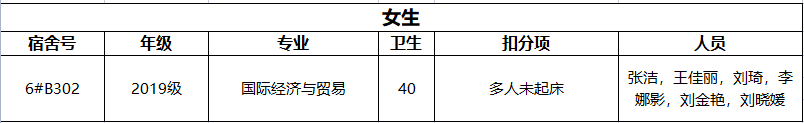 在本次的检查中,除了对宿舍整体卫生情况进行例行检查外,还对消防安全、违禁电器使用进行了重点检查,不合格宿舍如下: