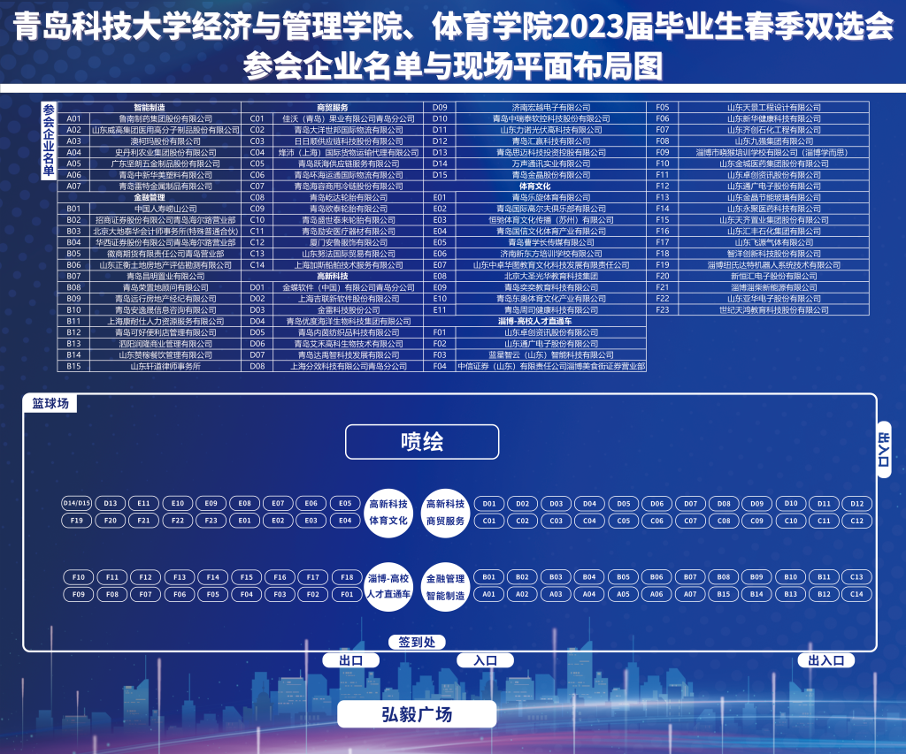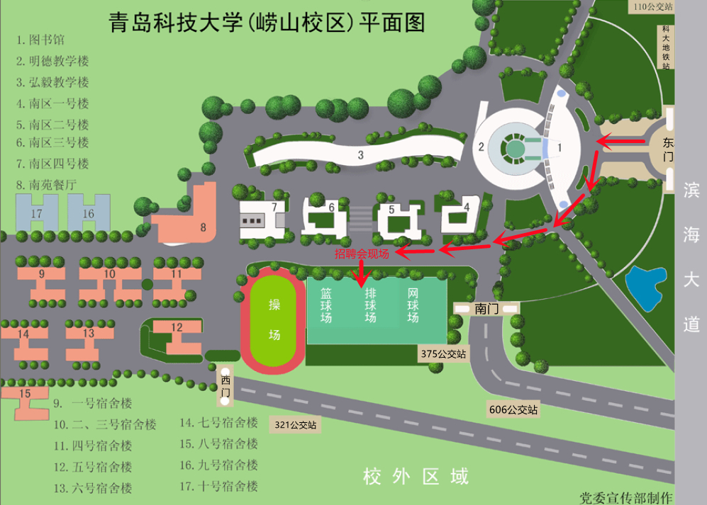 1.请参会企业于招聘会当天上午8:50之前到报道地点进行签到。招聘会位于山东省青岛市松岭路99号青岛科技大学崂山校区弘毅广场外篮球场,建议乘坐公共交通工具到校,自驾车请从东门(松岭路)入校,入校后左拐,直行500米左右,即可到达报道地点。车辆请按指定位置停放。