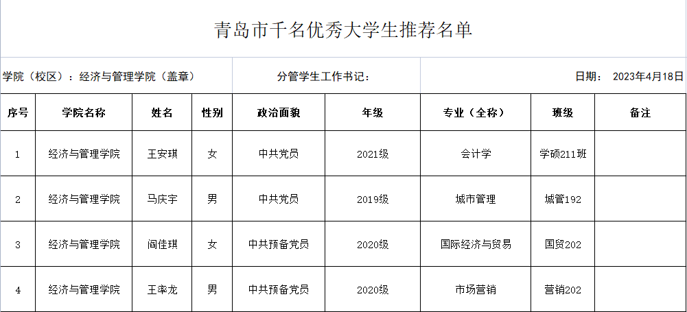 根据学校《关于评选2023年度“青岛市千名优秀大学生”的通知》的要求,经个人申请、材料审核,现将德州扑克俱乐部 “青岛市千名优秀大学生”候选人公示如下,公示时间2023年4月18日-2023年4月20日。