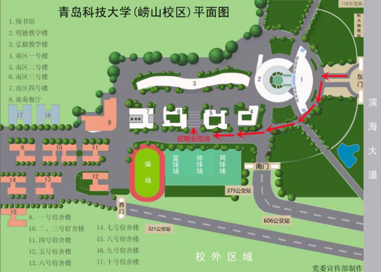 学校地址:山东省青岛市松岭路99号青岛科技大学崂山校区,乘321路、606路、629路、313路、375路公交车至青岛科技大学站下车或地铁11号线青岛科大站出站。自驾请从东门(松岭路)入校。