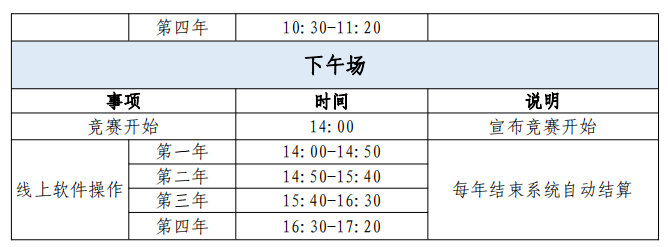 注:上表时间仅供参考,以实际发生为准。若出现某赛区参赛团队数量特别多,竞赛组委会将视情况分为上下午进行竞赛,一切以组委会通知和实际发生为准。若参赛团队无法按时提交决策,视同弃权。