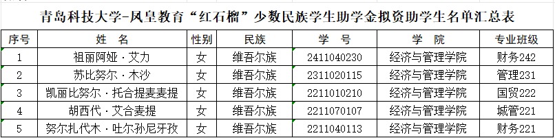 为深入贯彻落实党和政府的民族政策,加强对少数民族学生的培养,激励我院少数民族学生勤奋学习、努力进取,在德、智、体、美、劳等方面得到全面发展,根据学校《关于评选2024年度凤皇教育“红石榴”少数民族学生助学金的通知》评选要求,通过自主申报、公开评审等环节,确定助学金受助人选5人,公示如下: