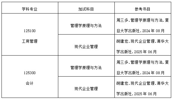 工商管理硕士专业学位(MBA)、会计硕士专业学位(MPAcc)和工程管理硕士专业学位(MEM)在复试中需加试政治理论,总分100分,得分计入复试成绩,成绩低于60分者不予录取。