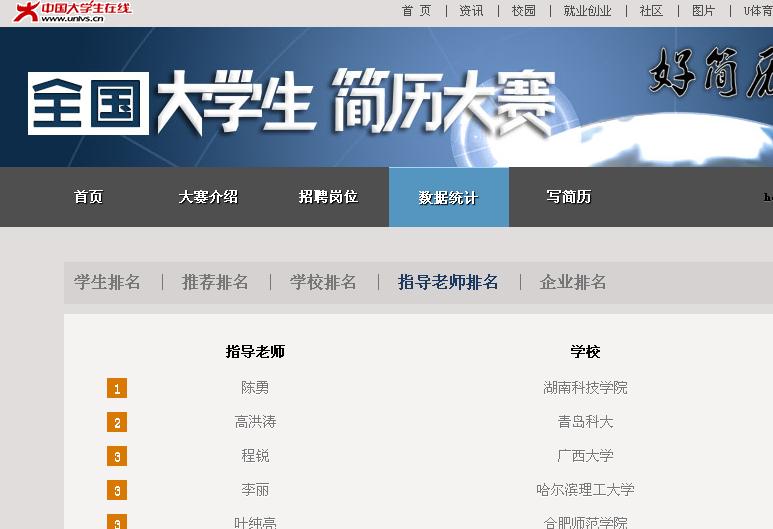 截止目前,全国大学生简历大赛,青岛科技大学指导老师高洪涛排在第二名。