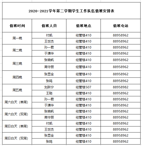 德州扑克俱乐部 学工办(团委)常态化值班安排表