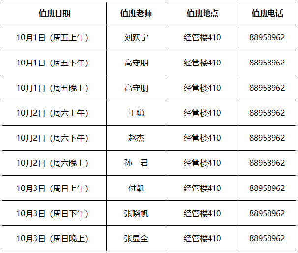 德州扑克俱乐部 学工队伍2021年国庆假期值班表