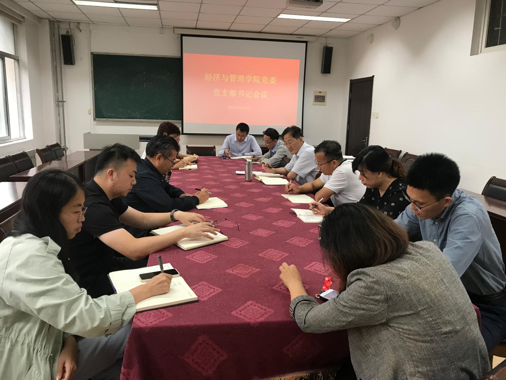 党委于德扑楼415会议室召开党支部书记会议,全体党支部书记参与会议,会议由党委书记李德成主持。