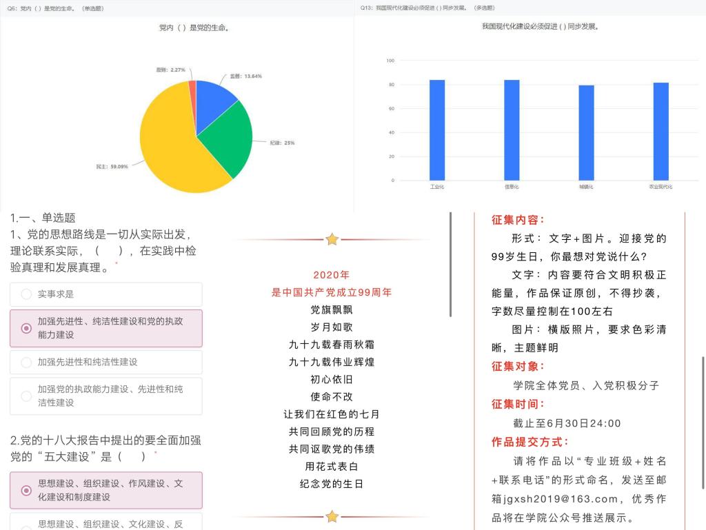 通过线上竞答的方式举办“追寻红色足迹,牢记党建史诗”易班答题活动,各系班主任和导师鼓励并组织学生通过易班平台,在线进行知识竞答,在手指间重温党史,参与学生纷纷表示上了一堂生动的”思政课”。