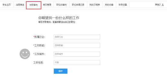 学生首次登录就业网,需填写求职意向信息,以便系统推荐合适的岗位信息,如图: