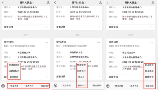 接收学校推送的就业信息,包括工作职位、招聘会、宣讲会、学校重大活动通知、讲座预约、等。如图: