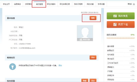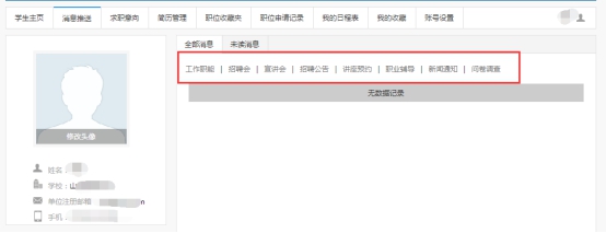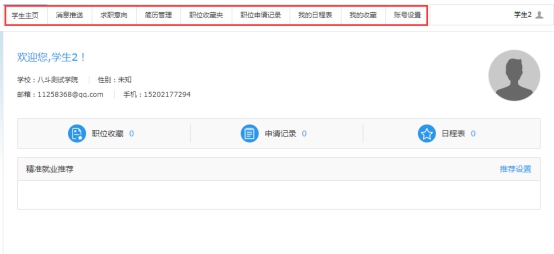 学生登录成功后,进入个人资料页面,可以查看消息推送,职位收藏,职位申请,我的日程表,我的收藏等,还可以进行简历管理与维护,账号设置等。如图: