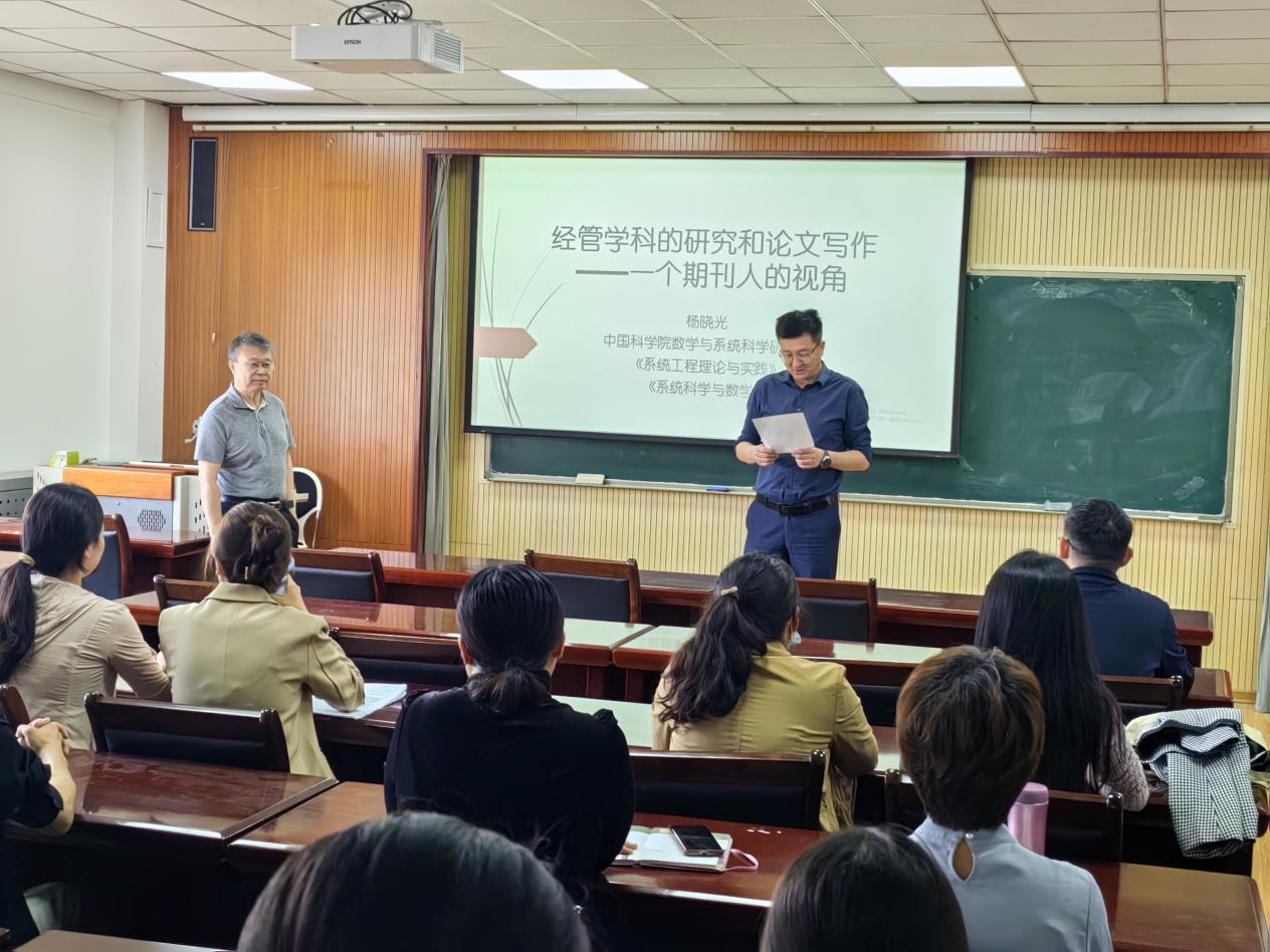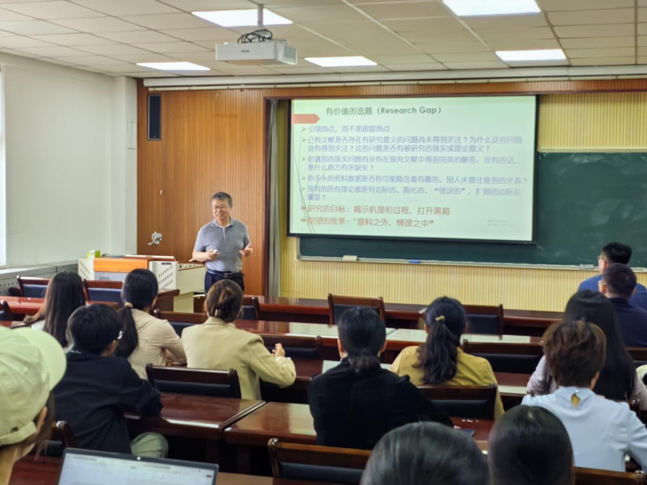 会后,杨教授热情邀请师生进行讨论和问答。本次论坛的举办,杨教授从期刊审稿人的视角给与会师生带来了全新的讲解,加深了大家在论文写作过程中对逻辑梳理和数据模型部分的理解与认识,为后续的科研和学术研讨丰富了视角。与会师生要勇于理论建设,敢于高屋建瓴,对研究角度的选择和学术成果的产出有着重要的指导意义。