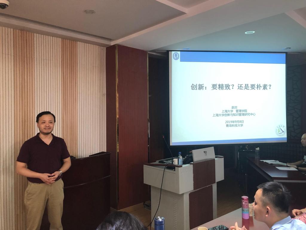 随后,赵炎教授作了题为《创新:要精致?还是要朴素?》的专题讲座,报告围绕创新的两种不同方式进行展开。赵炎教授首先通过举例来介绍了朴素性创新和精致性创新的概念,对于两种创新方式的特点、作用与不同进行了阐述,随后以福特汽车、矿车管理系统等多个实际案例方式,对于两种创新的具体方式、存在的一些问题以及具体的解决措施进行了详实的讲解。最后通过对于两种方式的优缺点对比,结合我国经济和商业发展的现状,对于如何创新提出了建议。在报告结束以后,赵炎教授解答了老师和同学们提出的几个问题,现场的气氛十分热烈。