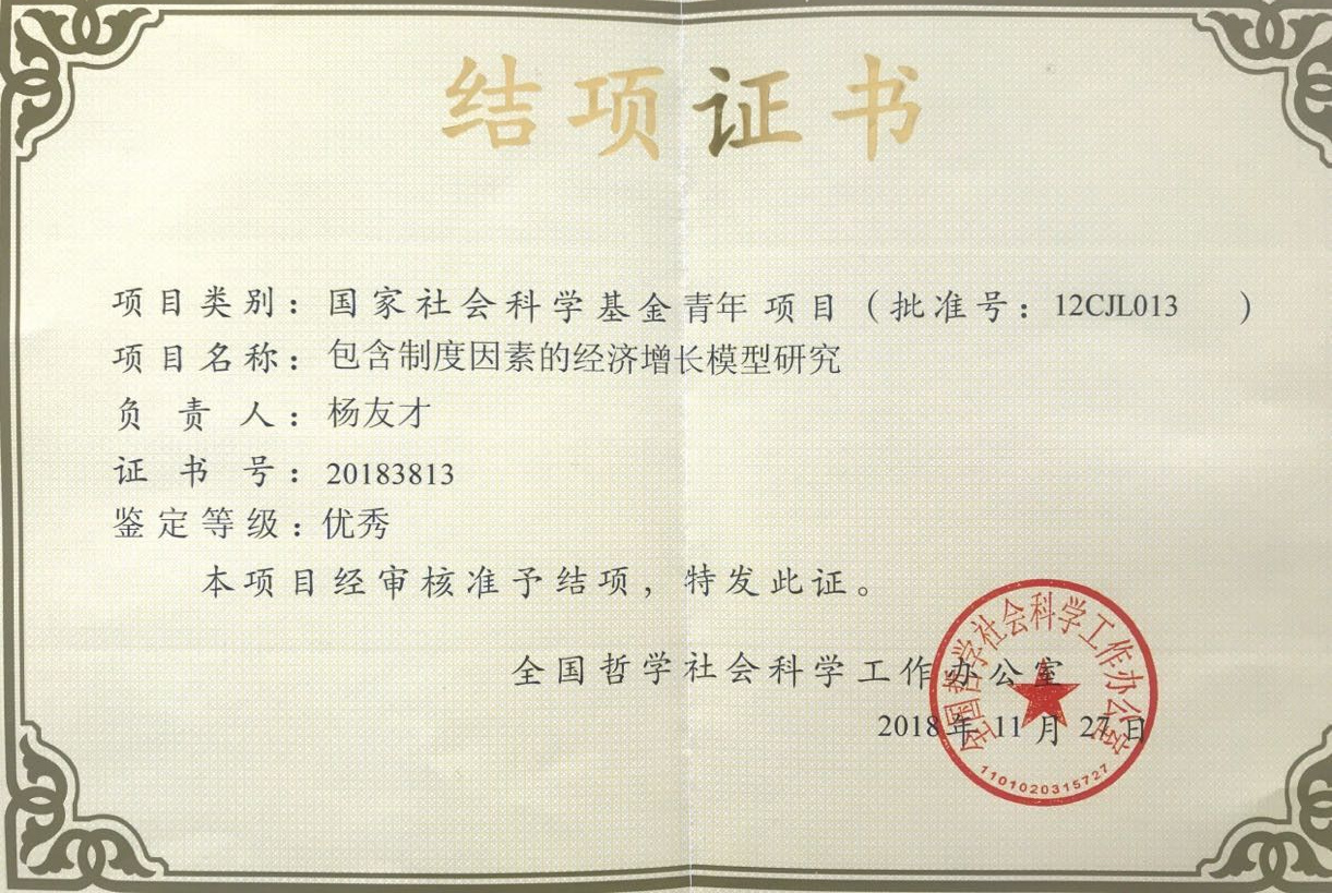 收到了一份沉甸甸的证书:杨友才教授所主持的国家社科基金《包含制度因素的经济增长模型研究》通过结题验收,等级为“优秀”。这是我校国家社科基金结题首次获得优秀。课题组在《金融研究》、《学术月刊》、《statistics and Probability Letters》、国务院研究《决策参考》等CSSCI、SCI杂志和重要刊物发表论文11篇,并与国内外一些著名经济学家形成了良好的合作机制。最终成果包括10万多字论文集和10万字以上研究报告,并完成了多名研究生的培养。项目组超额完成预定的研究任务,在一些理论上实现突破,具有较强的社会影响与应用价值。