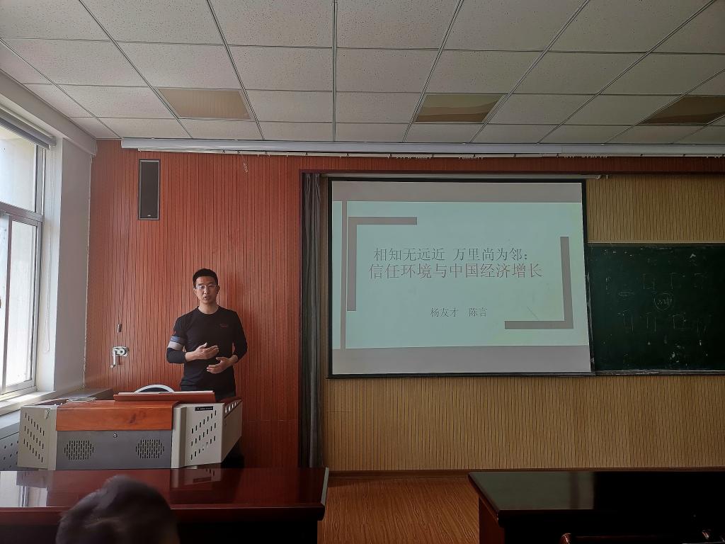 会议开始,杨友才教授首先向我院师生分享了一篇题为“信任缓环境与中国经济增长”的论文。杨教授研究制度经济学多年,擅长将经济学概念纳入数理模型中并进行合理的推导,此论文是一篇以抽象概念“信任”为主题的数理模型推导论文。首先,杨教授以一句古语“相知无远近,万里尚为邻”生动地引出了“信任”的背景,提出该论文的主要创新点是构建一个“信任环境”,分别研究该环境对个人收入和中国经济增长产生的影响。然后,他从数理模型推导和模型实证两方面出发,系统地阐述了论文的主要内容,使师生们更深入地了解该论文的模型构建过程和主要贡献。通过实证结果他发现,信任水平对人均收入和经济产出确实有显著的正向影响,因而在以后的研究中,我们应该充分考虑到信任因素的有效作用。