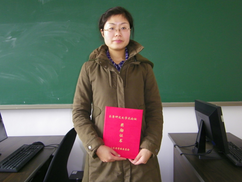 会上山东省人民政府学位委员会为全省各个大学研究生论文获奖者颁发了奖励证书。我校MBA首届学员李芹参选论文“基于零和灰色博弈模型的公路隧道安全与节能研究”经过专家匿名评审,最终获得二等奖,李芹同学代表学员对自己获奖论文进行现场汇报、交流。