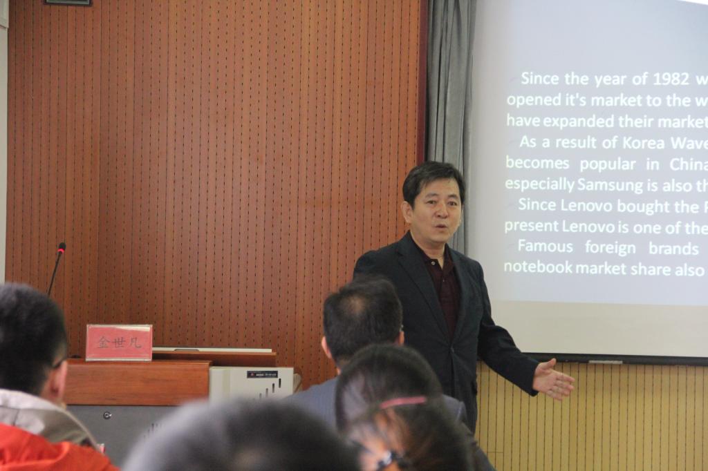 讲座期间,金世凡教授以联想、三星、索尼品牌的笔记本电脑为例,分别对应着中国、韩国、日本三个国家。从品牌个性、品牌形象、国家形象、品牌偏好四个方面进行详细介绍,赋予品牌人的个性。该讲座幽默风趣、科学而新颖。