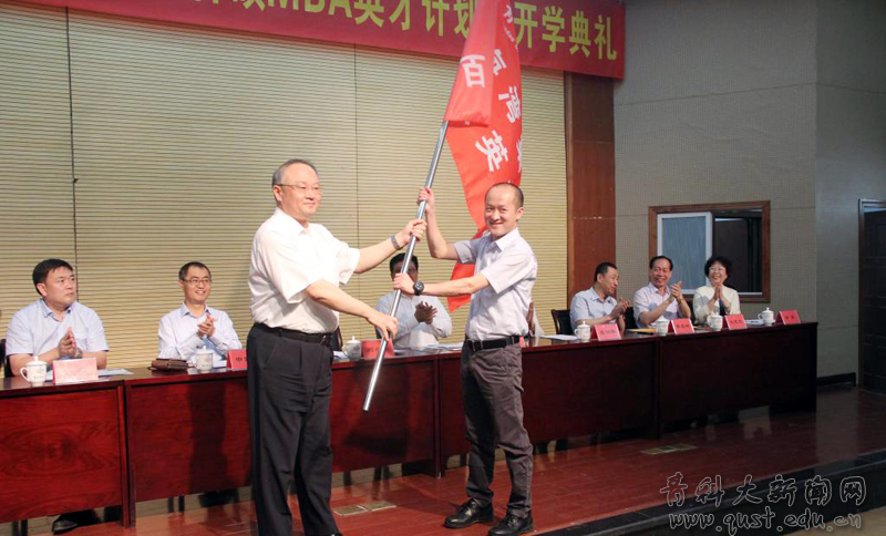 开学典礼上,刘兴云为“百硕MBA英才班”授班旗。