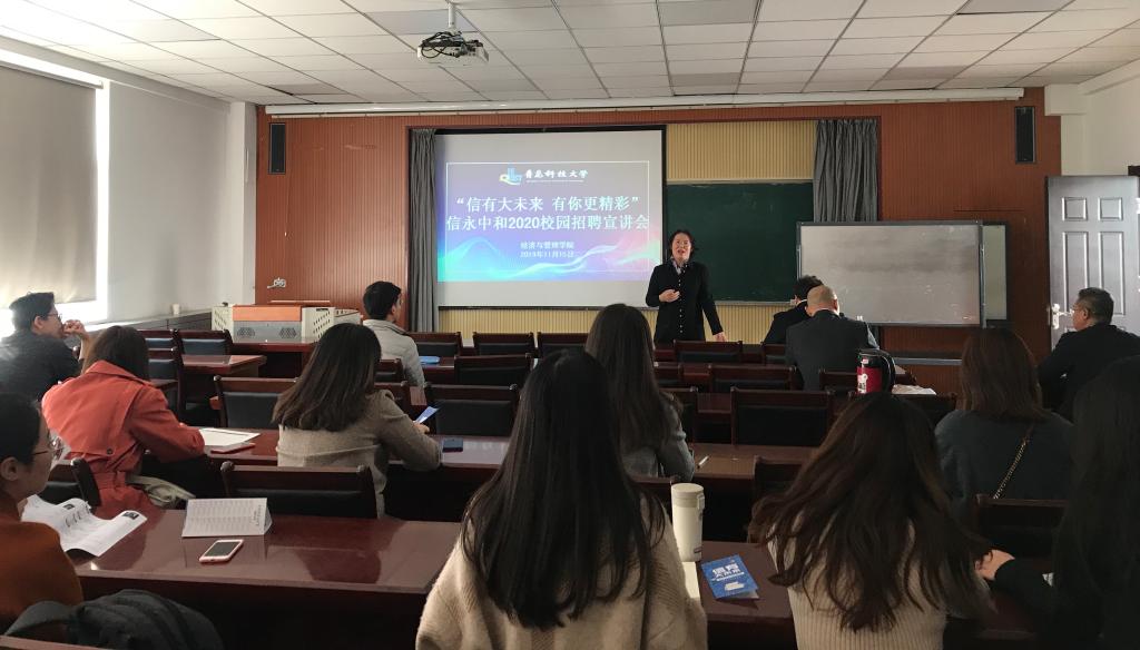 应届毕业生的基本情况做出简要介绍,随后,信永中和宋总通过播放宣传片、PPT等方式向同学们展示了信永中和的发展概况、管理体系、业务板块和发展目标,并现场解答了同学们关于应聘具体要求、就职后职业发展前景、薪资待遇、本科生硕士生就业形势等方面的问题,让在座的同学尽可能深入地了解企业以及个人职业发展路径。最后,信永中和胡总结合自身工作经历,与同学们分享了信永中和一体化管理的体制机制,以及风险控制等方面的优势。有求职意向的应届毕业生现场递交了个人简历并进行了咨询。