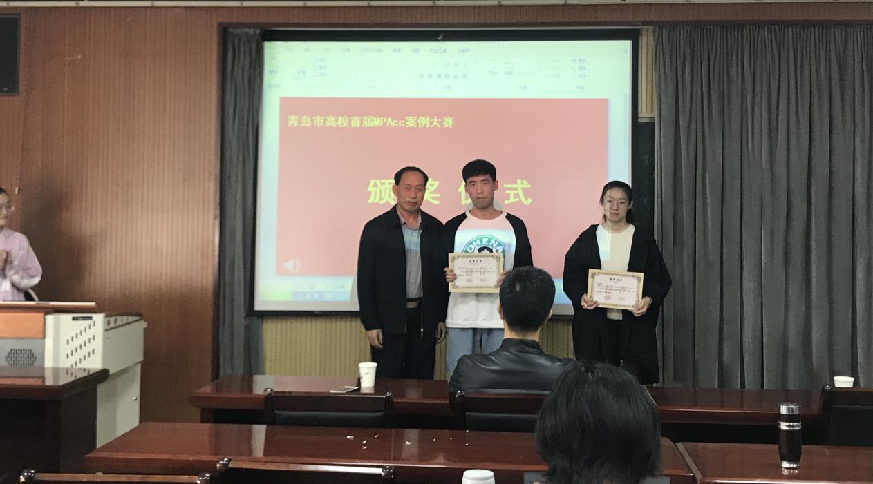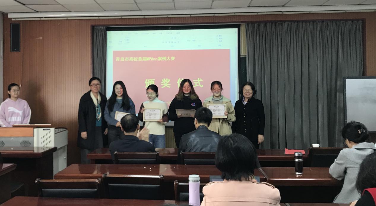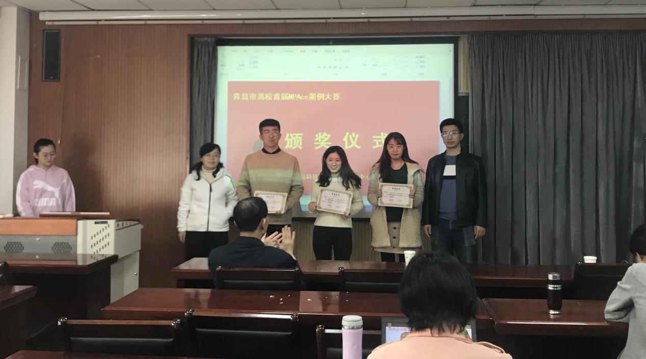 院长王志宪教授、副院长杨友才教授和董华教授、MPAcc教育中心主任刘树艳教授以及财务与会计系主任张占贞教授为在青岛市高校首届MPAcc案例大赛初赛中获奖的队伍颁奖,其中,获得一等奖的是:skrplus队、超越队;获得二等奖的有:七喜队、星辰队、WIN了队;获得三等奖的是太阳系队、尽力而为队、非常六加一队、R战队。