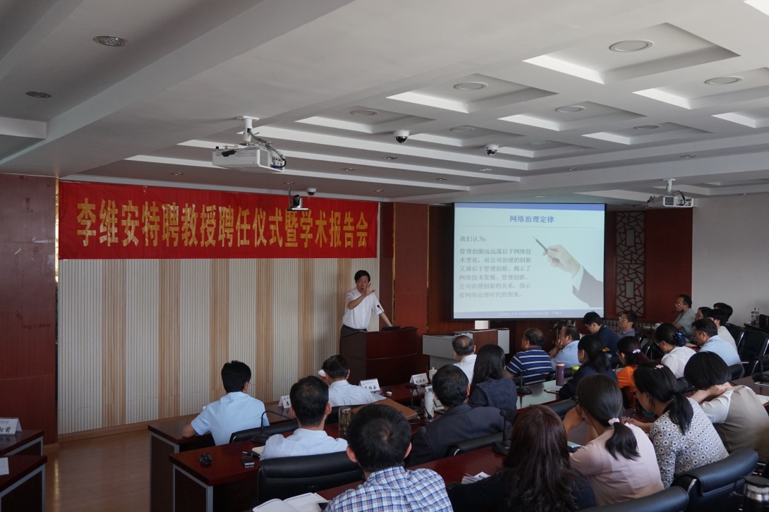聘任仪式结束后,李维安教授从公司治理的历史变迁入手做了一场主题为《网络治理与自组织》的学术报告会。报告的主题为网络治理与自组织,主要分为四个部分。第一部分是从公司治理到网络治理的研究脉络,讲述了两条路线,即利用网络进行治理和对网络组织进行治理。同时,对网络治理的四条特征进行了细致阐述。第二部分是移动互联网强化网络治理,讲述了移动互联网的变迁,移动互联网技术与治理的方式,包括企业间的联系方式、公司治理的发展以及组织创新模式。对企业网络治理的多种形式进行了研究,重点说明了移动互联网、大数据同网络治理的关系。第三部分是移动互联网时代的治理变革,讲述了网络三定律,同时加入了自己理解的网络治理定律,认为管理创新远远落后于网络技术变化,而公司的创新又滞后于管理创新。第四部分是“自组织”时代的真正到来,对其定义以及推动治理扁平化、破除信息垄断,推动治理现代化的作用进行了详细介绍。报告结束后,李维安教授与同学们就有关公司治理的问题进行了深入的探讨和交流。